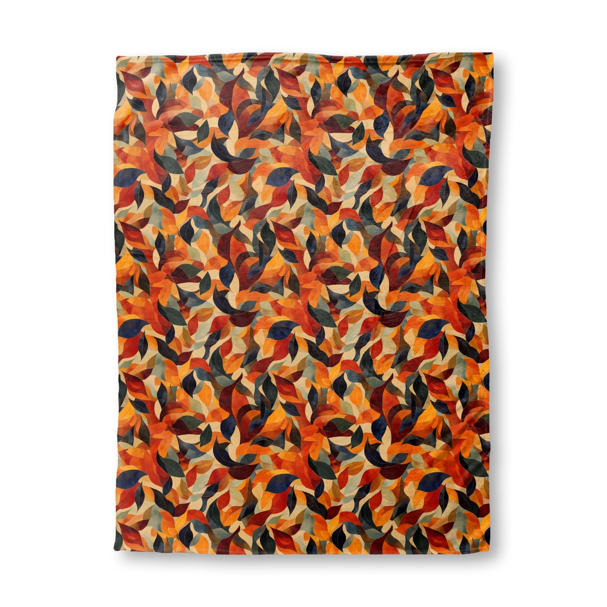 A stylized, abstract pattern of overlapping autumn leaves fills the frame. A rich, warm palette of orange, red, and brown is contrasted by deep blues and dark greens, creating a dynamic, mosaic-like texture reminiscent of stained glass.