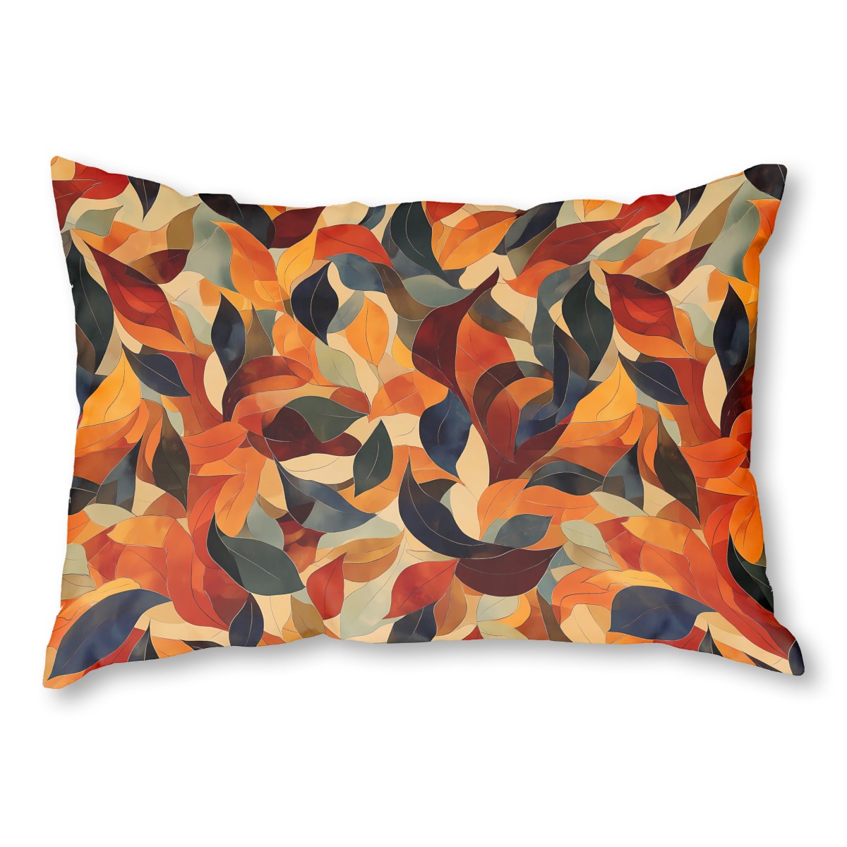 A stylized, abstract pattern of overlapping autumn leaves fills the frame. A rich, warm palette of orange, red, and brown is contrasted by deep blues and dark greens, creating a dynamic, mosaic-like texture reminiscent of stained glass.