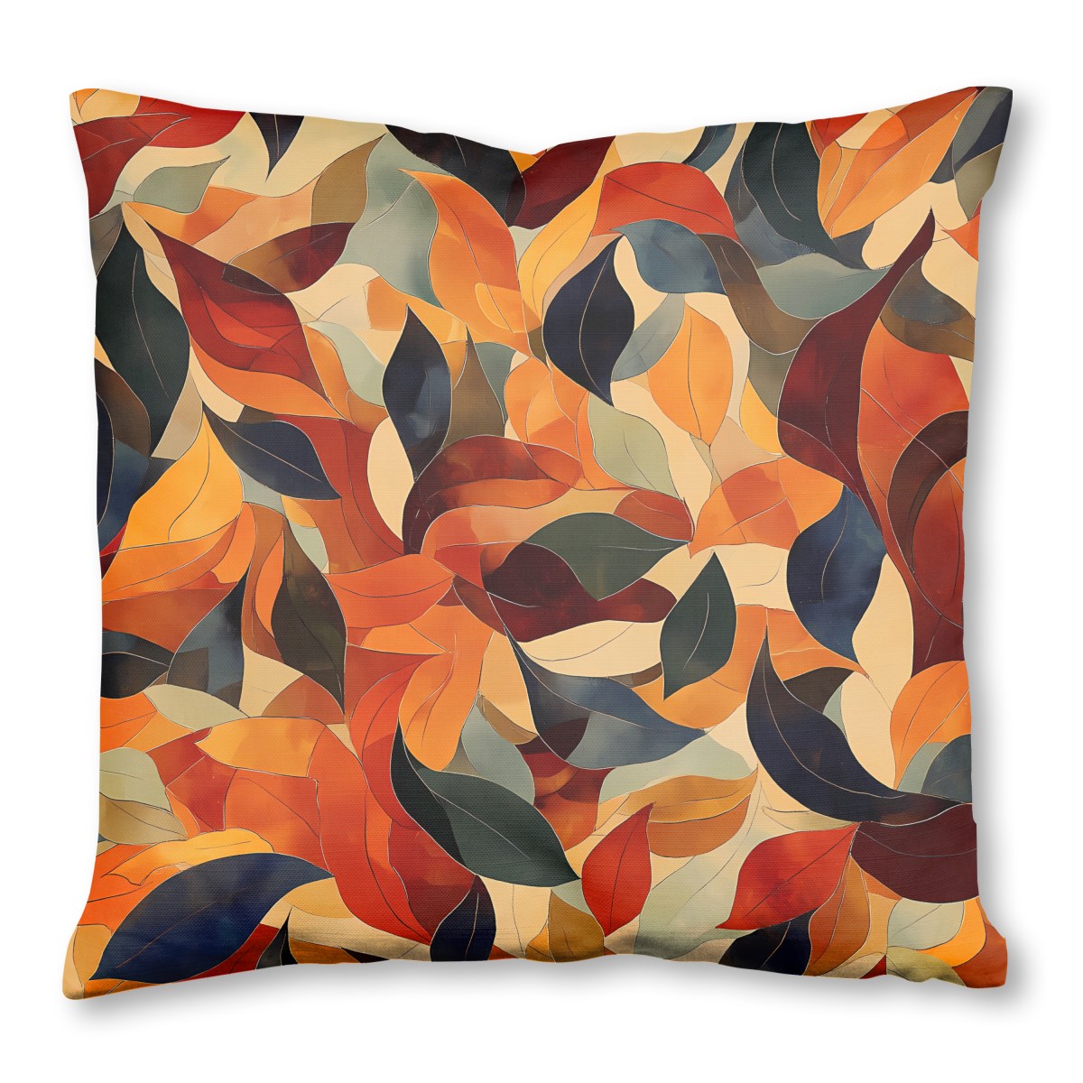 A stylized, abstract pattern of overlapping autumn leaves fills the frame. A rich, warm palette of orange, red, and brown is contrasted by deep blues and dark greens, creating a dynamic, mosaic-like texture reminiscent of stained glass.
