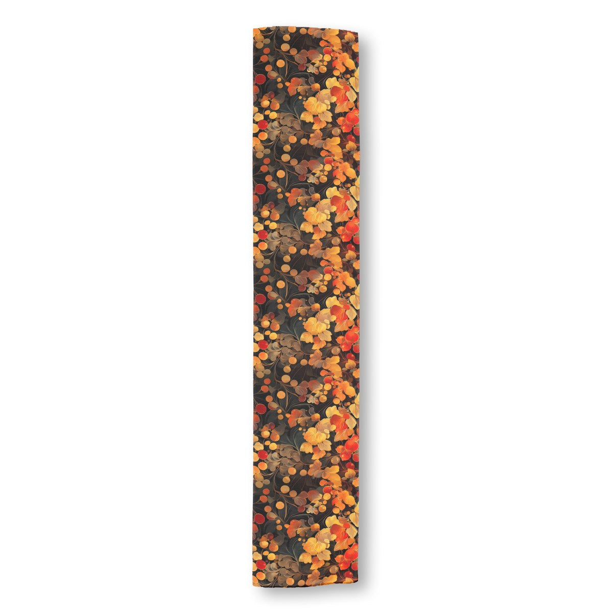 A vibrant, stylized botanical pattern features glowing leaves and berries in warm autumnal shades of orange, red, and yellow. The elegant, swirling elements are set against a dark background, creating a rich and dynamic composition with a painterly feel.