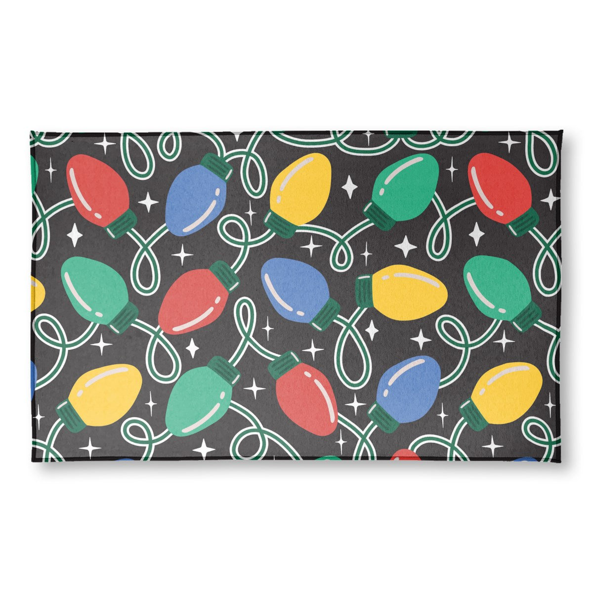 A festive, repeating pattern of colorful Christmas lights. The red, blue, green, and yellow bulbs are strung on looping white wires against a black background. White sparkles add a touch of magic to the cheerful, retro-style holiday design.