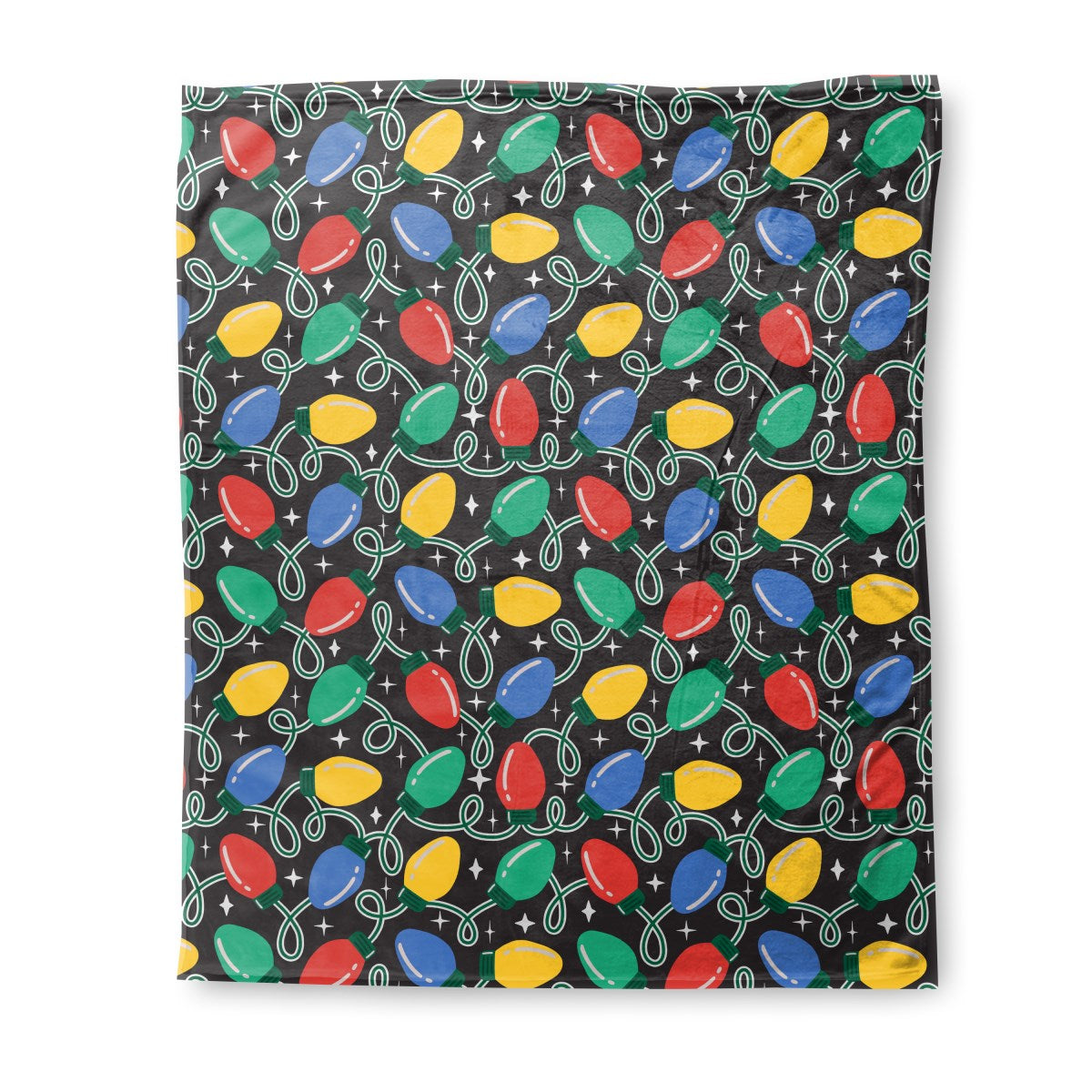 A festive, repeating pattern of colorful Christmas lights. The red, blue, green, and yellow bulbs are strung on looping white wires against a black background. White sparkles add a touch of magic to the cheerful, retro-style holiday design.