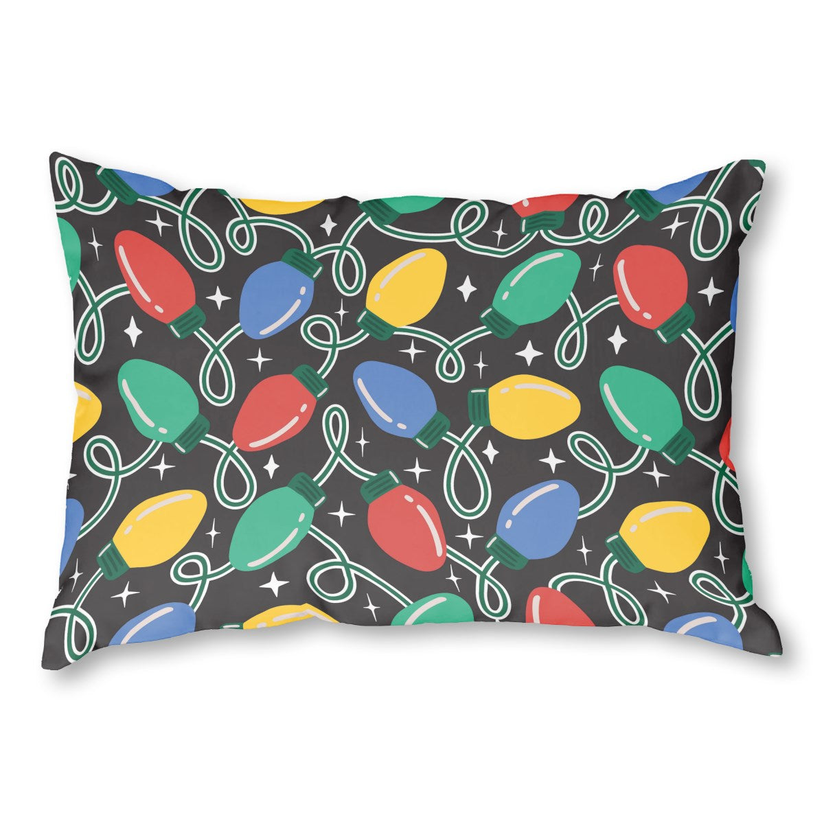 A festive, repeating pattern of colorful Christmas lights. The red, blue, green, and yellow bulbs are strung on looping white wires against a black background. White sparkles add a touch of magic to the cheerful, retro-style holiday design.