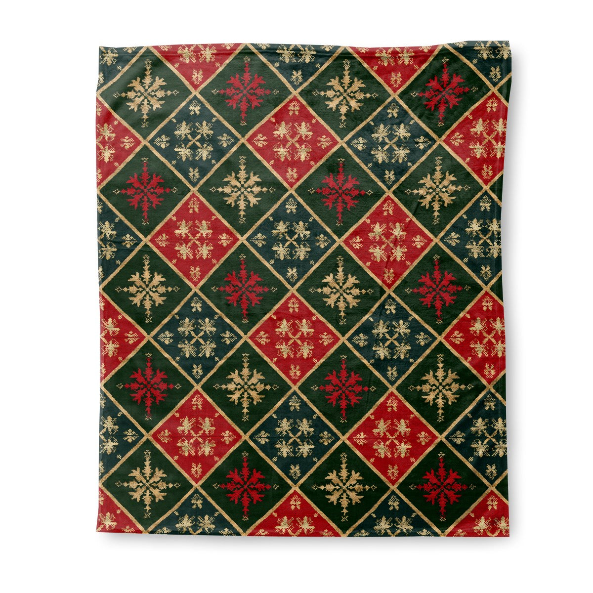 A festive, knitted textile pattern featuring red, green, and dark blue diamonds outlined in gold. Each diamond contains intricate snowflake motifs, evoking the cozy feel of a traditional Christmas sweater or tapestry.