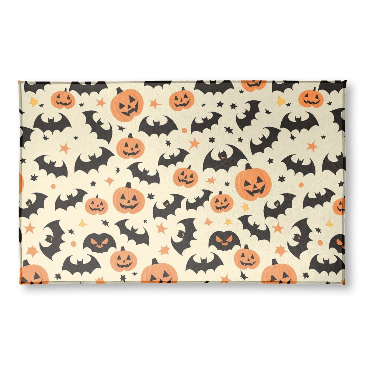 A cheerful, seamless Halloween pattern featuring smiling jack-o'-lanterns, black bat silhouettes, and small stars. The festive cartoon design is set against a light cream-colored background, creating a fun and spooky theme.