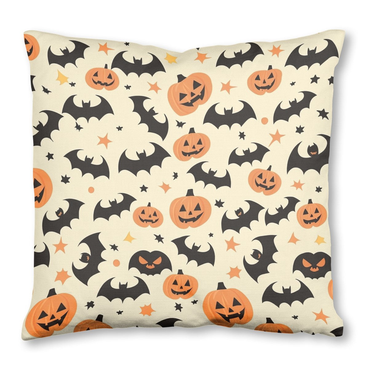 A cheerful, seamless Halloween pattern featuring smiling jack-o'-lanterns, black bat silhouettes, and small stars. The festive cartoon design is set against a light cream-colored background, creating a fun and spooky theme.