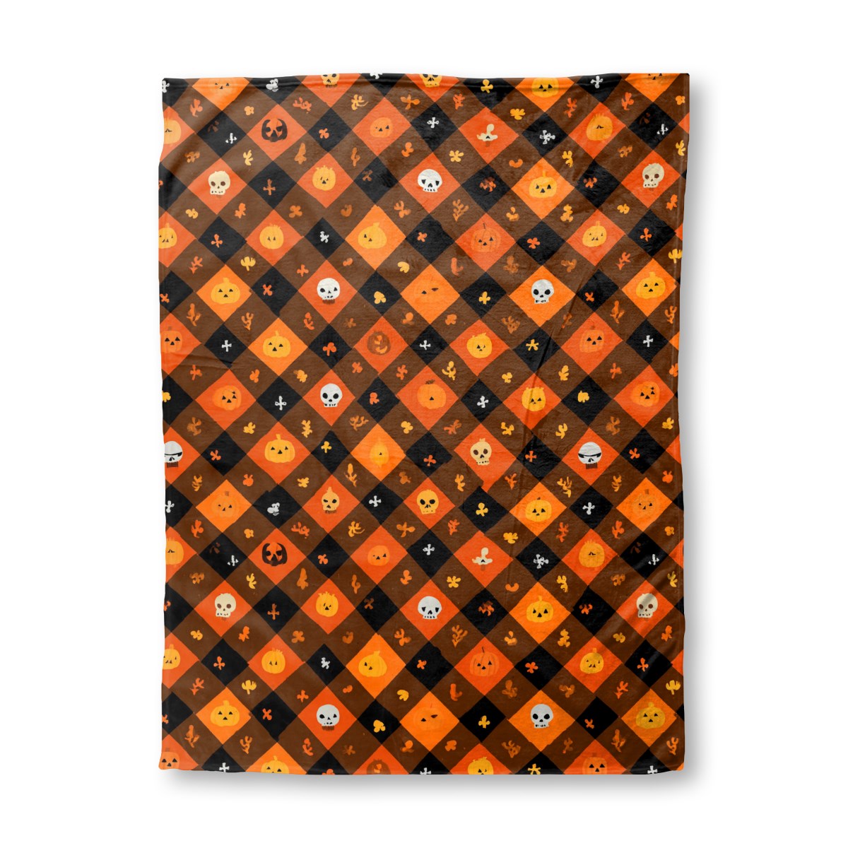 A whimsical, seamless Halloween pattern featuring a diagonal plaid in orange, black, and brown. The design is scattered with hand-drawn, cartoonish skulls, jack-o'-lanterns, and other small autumnal motifs, creating a festive and spooky-cute feel.
