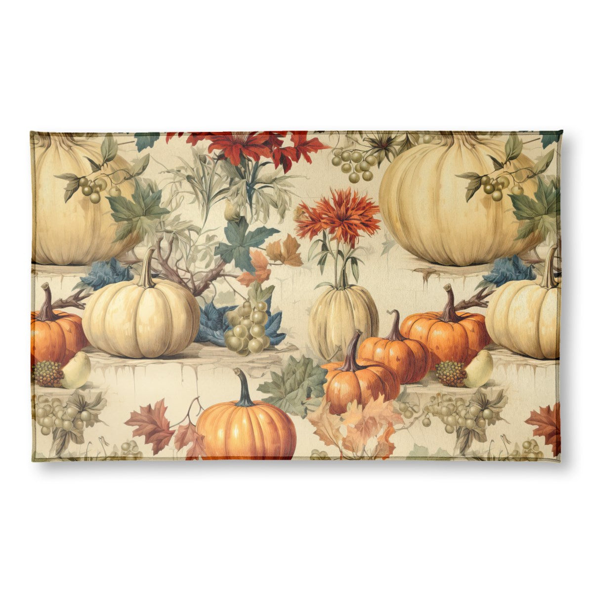 A vintage-style illustration of a bountiful autumn harvest. Orange and pale pumpkins, grapes, and colorful foliage are arranged on tiered stone ledges, creating a rich, decorative pattern with a classic, botanical feel.
