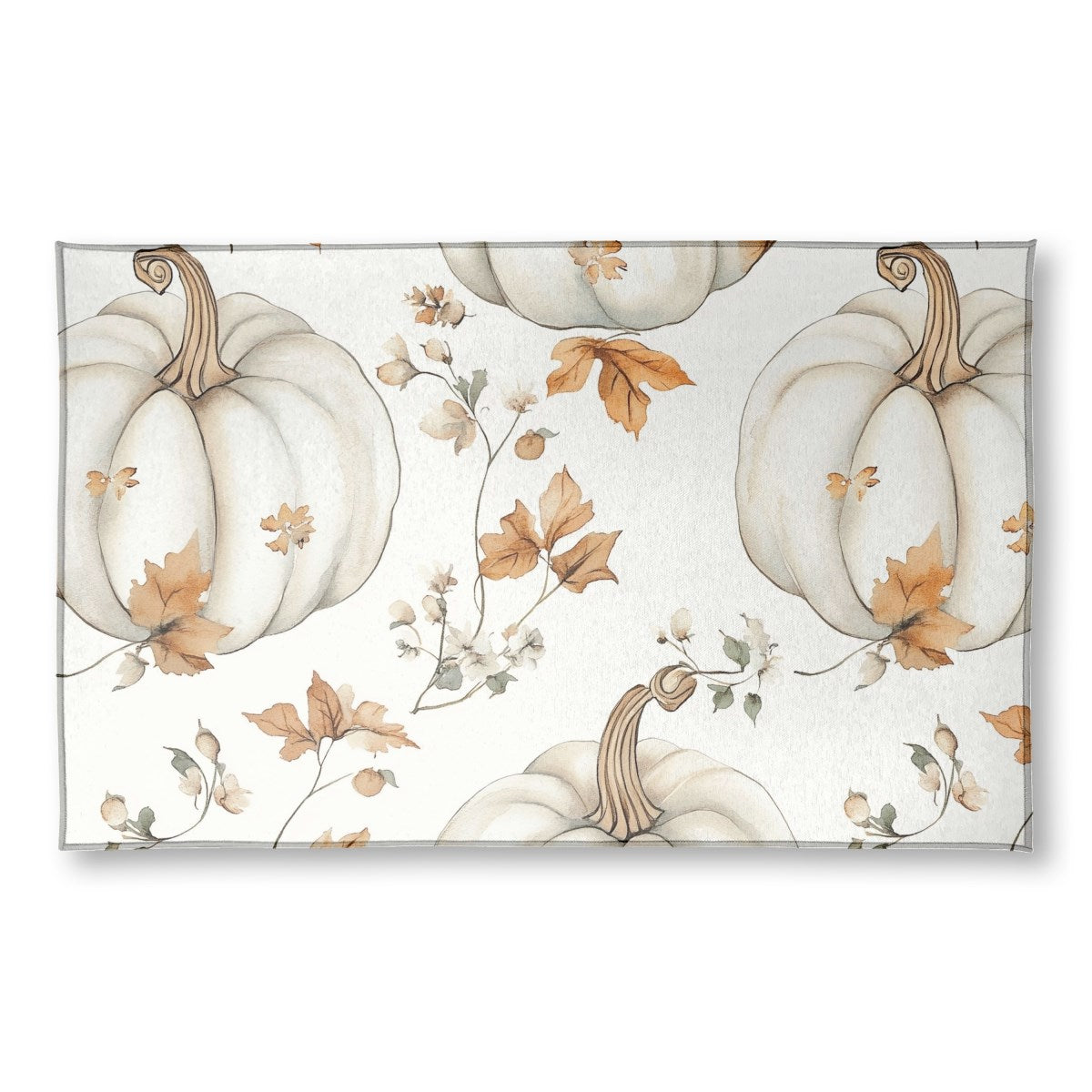 This is a delicate watercolor pattern featuring elegant white pumpkins. The design is interspersed with rustic brown autumn leaves, small white flowers, and trailing vines on a clean background, creating a soft and sophisticated fall aesthetic.