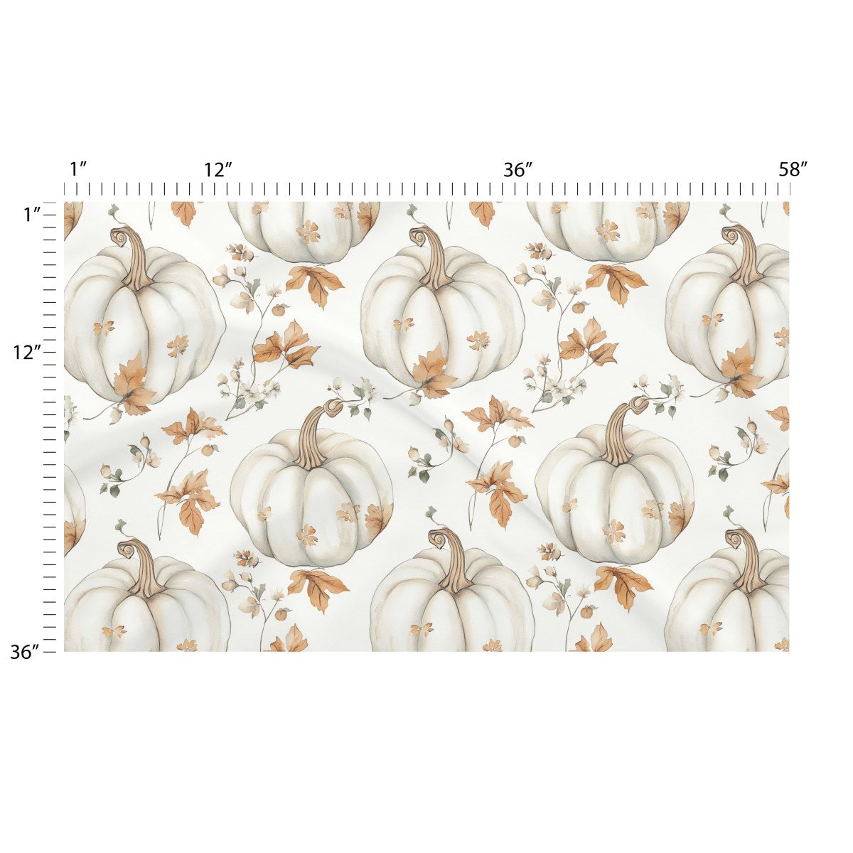 This is a delicate watercolor pattern featuring elegant white pumpkins. The design is interspersed with rustic brown autumn leaves, small white flowers, and trailing vines on a clean background, creating a soft and sophisticated fall aesthetic.