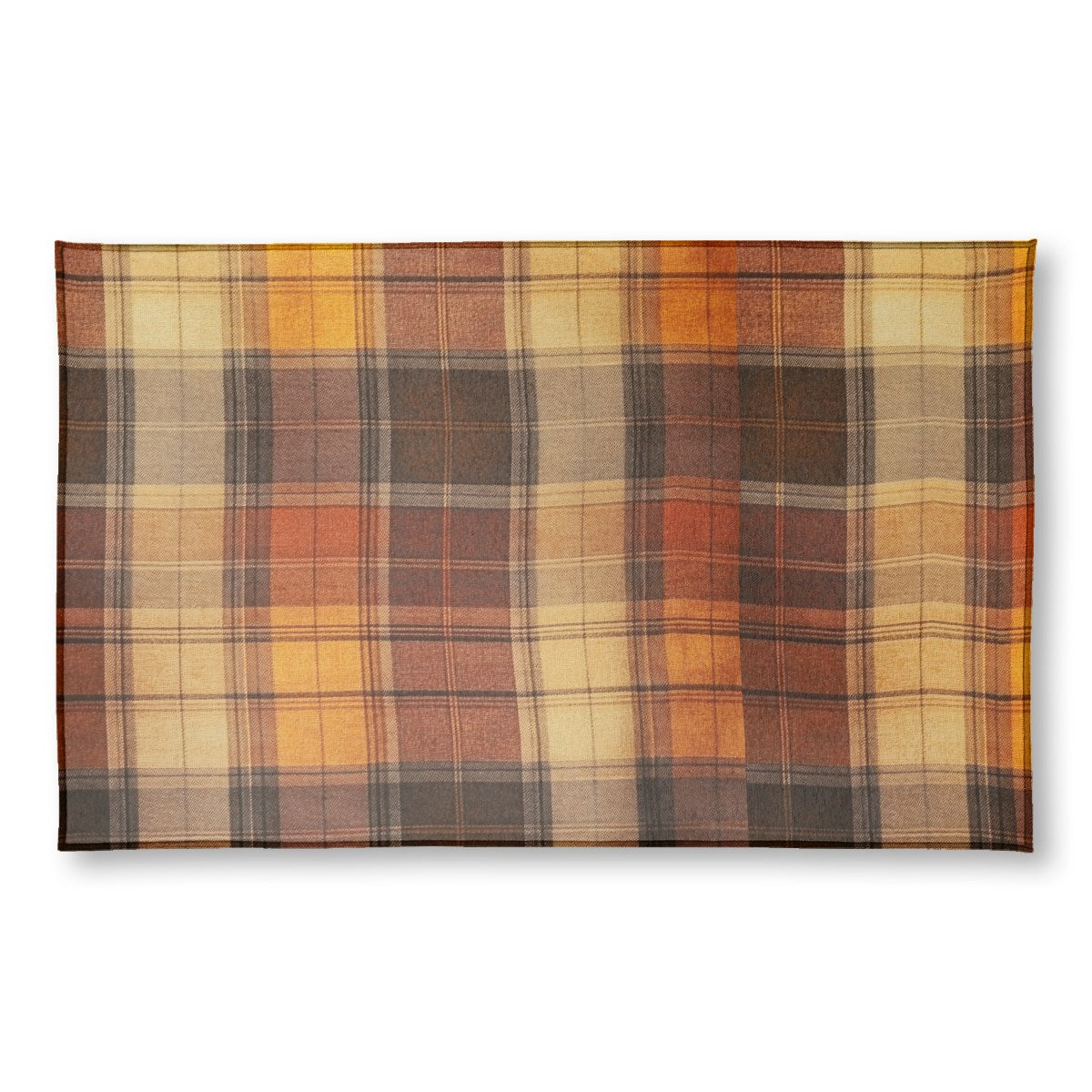 A close-up of a textured plaid fabric in a warm, autumnal color palette. The classic tartan pattern features intersecting stripes of brown, orange, mustard yellow, and beige, creating a cozy and rustic look.