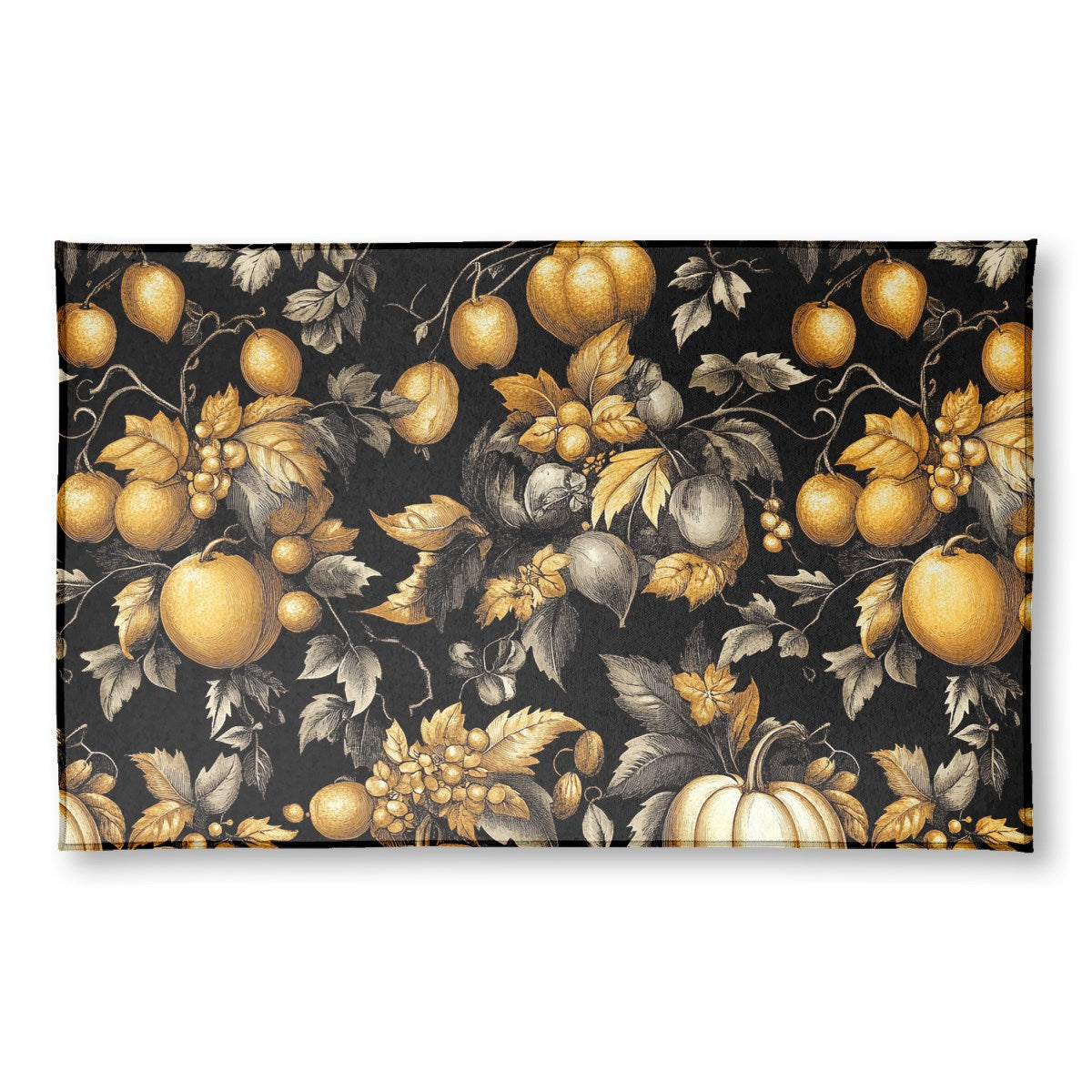 A luxurious, vintage-style pattern of autumnal fruits and foliage. Rendered in a detailed engraving style, golden pumpkins, apples, and grapes contrast richly with silver-toned leaves against a dramatic black background, creating an opulent and seamless design.