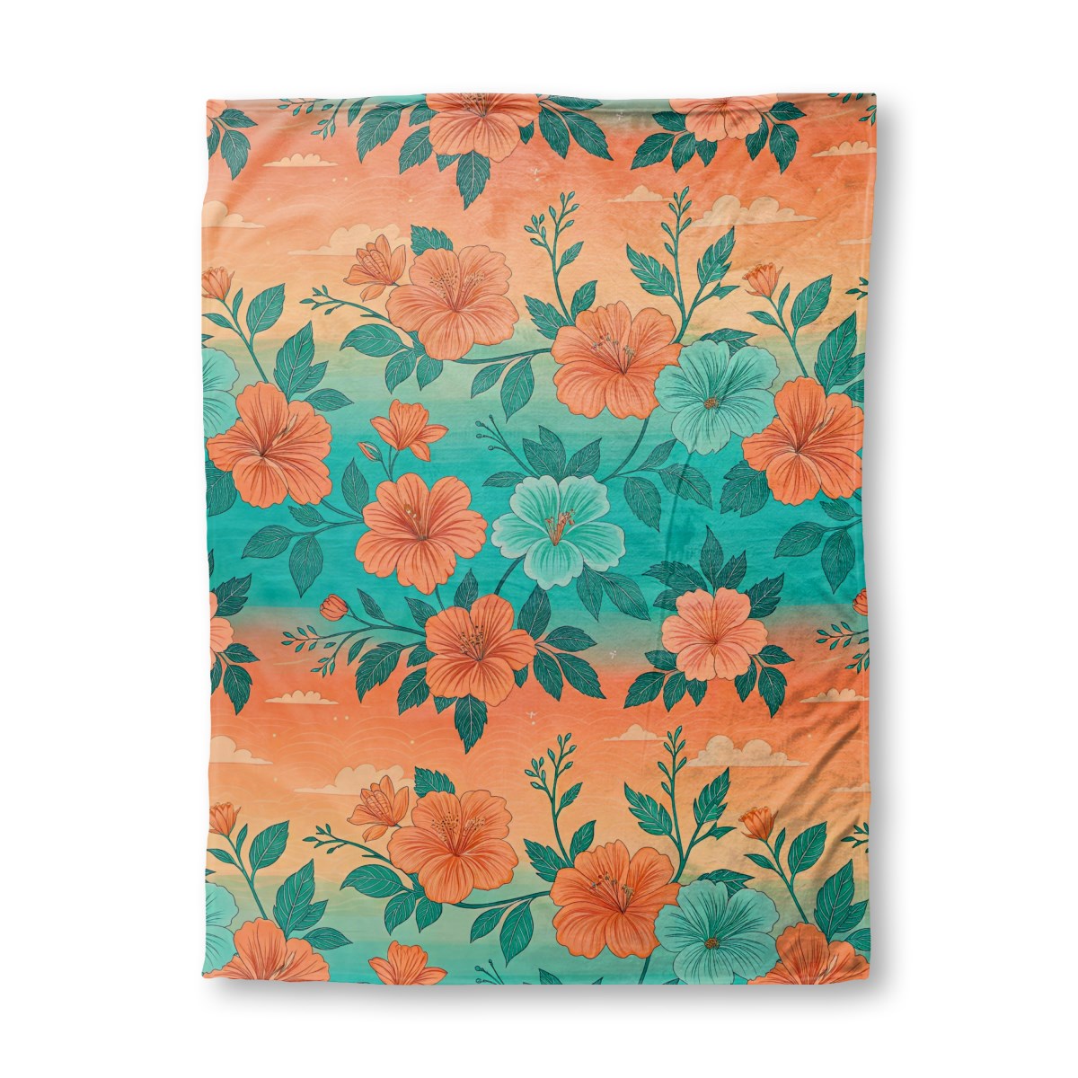 A vibrant, retro-style pattern of orange and teal hibiscus flowers with dark green leaves. The background is a stylized sunset gradient, shifting from warm orange to cool turquoise, with subtle clouds creating a serene, tropical atmosphere.