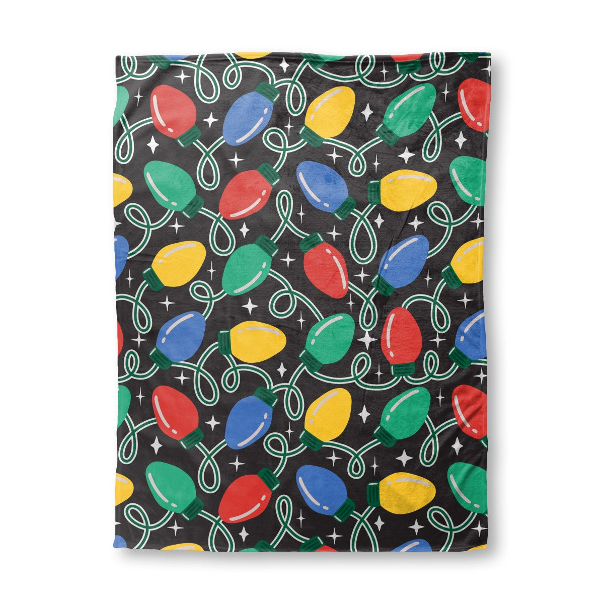 A festive, repeating pattern of colorful Christmas lights. The red, blue, green, and yellow bulbs are strung on looping white wires against a black background. White sparkles add a touch of magic to the cheerful, retro-style holiday design.