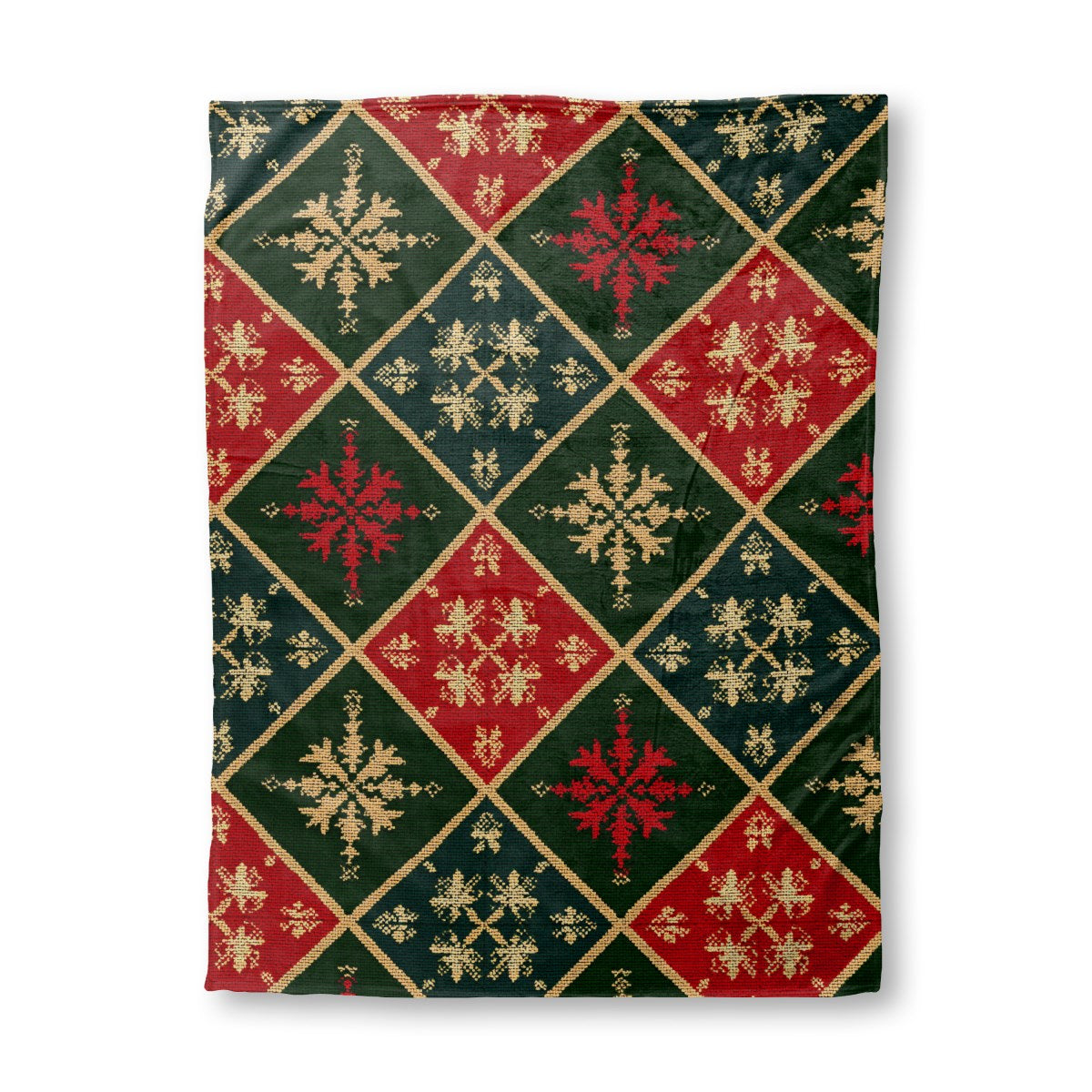A festive, knitted textile pattern featuring red, green, and dark blue diamonds outlined in gold. Each diamond contains intricate snowflake motifs, evoking the cozy feel of a traditional Christmas sweater or tapestry.