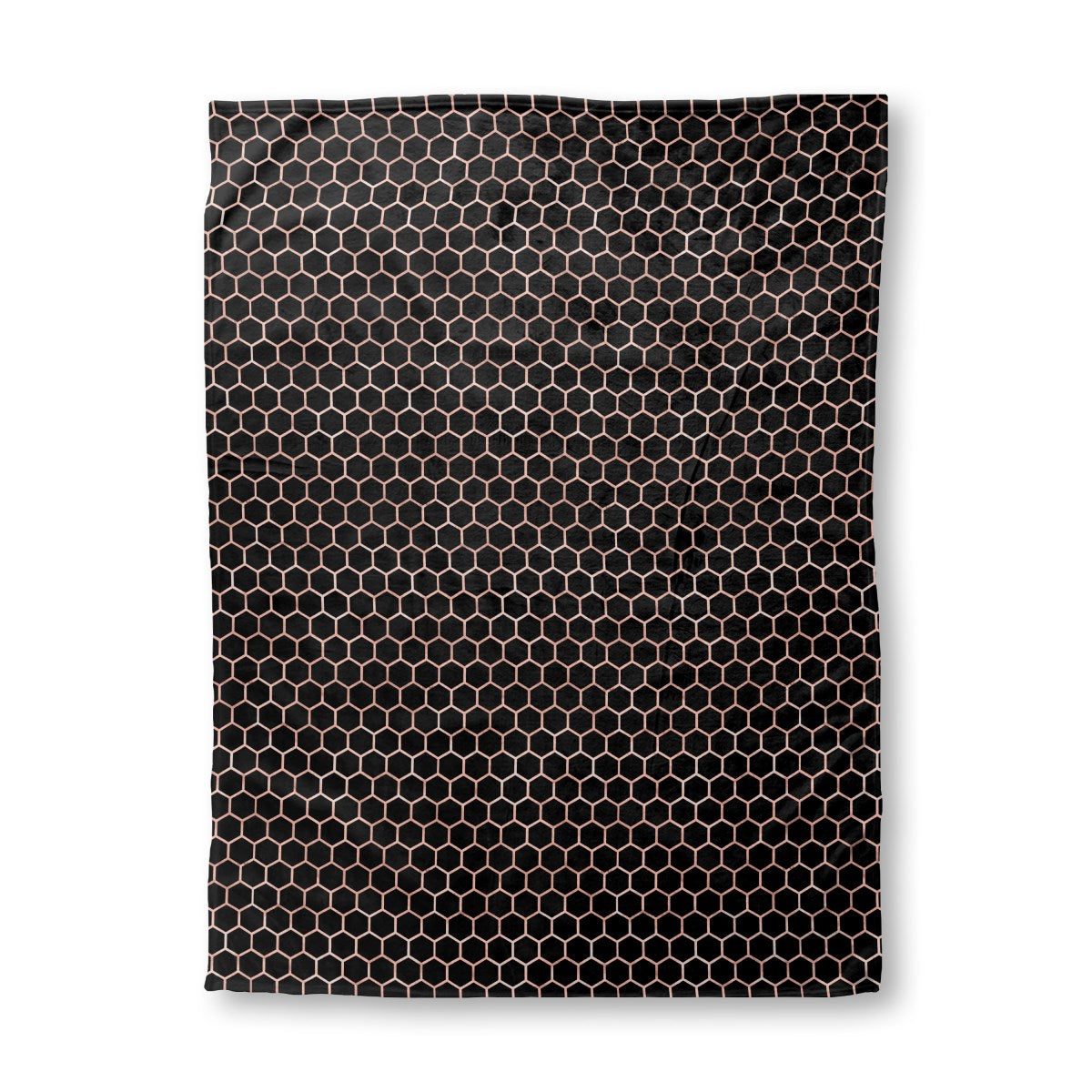 A seamless honeycomb pattern with thin, rose gold metallic lines creates a repeating grid of hexagons. The elegant, geometric design is set against a solid black background, producing a modern and striking contrast.