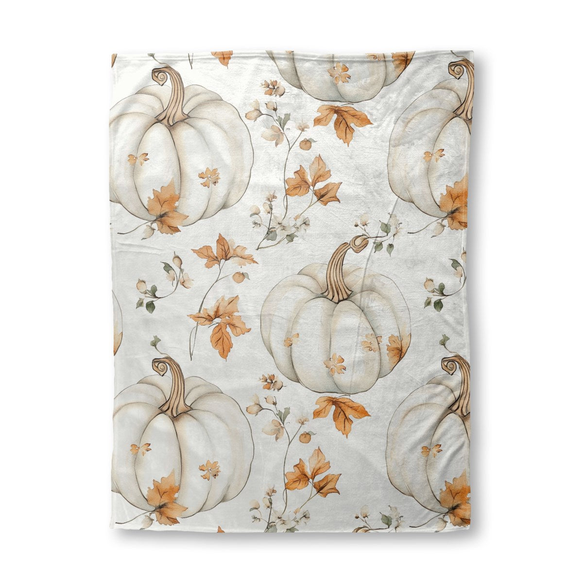 This is a delicate watercolor pattern featuring elegant white pumpkins. The design is interspersed with rustic brown autumn leaves, small white flowers, and trailing vines on a clean background, creating a soft and sophisticated fall aesthetic.