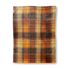 A close-up of a textured plaid fabric in a warm, autumnal color palette. The classic tartan pattern features intersecting stripes of brown, orange, mustard yellow, and beige, creating a cozy and rustic look.