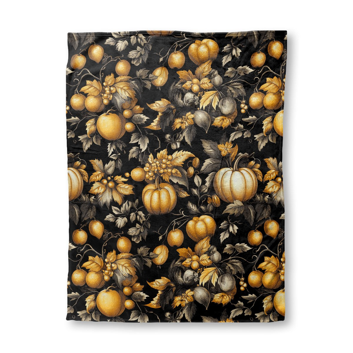 A luxurious, vintage-style pattern of autumnal fruits and foliage. Rendered in a detailed engraving style, golden pumpkins, apples, and grapes contrast richly with silver-toned leaves against a dramatic black background, creating an opulent and seamless design.