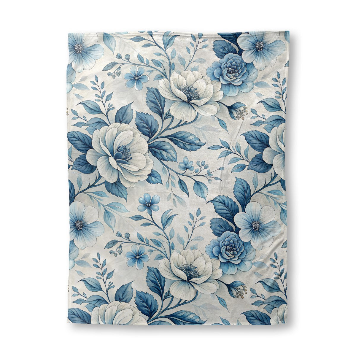 This is an elegant seamless pattern of blue and white flowers. Rendered in a delicate, watercolor-like style, the blossoms and dark blue leaves are set against a light, textured background, creating a classic and serene botanical design.