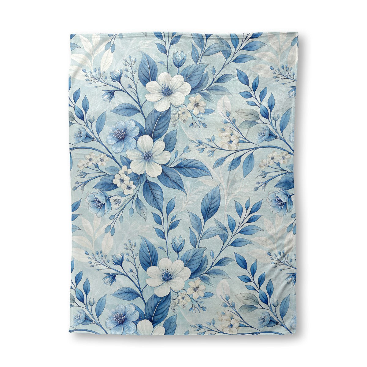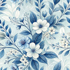 An elegant floral pattern featuring intricate white and blue blossoms with deep blue leaves. The delicate arrangement is set against a soft, textured, light blue background, creating a serene and classic design with a watercolor-like feel.
