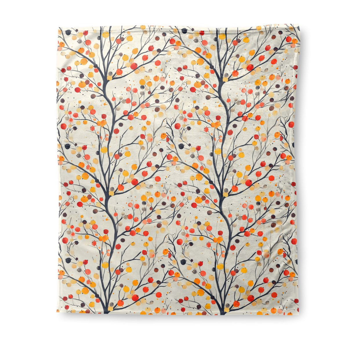 A whimsical, stylized illustration of a tree with dark, slender branches. It is adorned with round, colorful leaves or berries in warm autumnal hues of red, orange, and yellow against a light, speckled background, evoking a watercolor-style aesthetic.