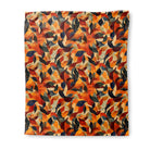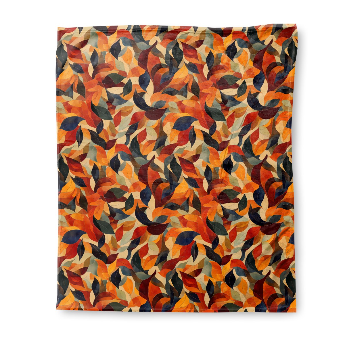 A stylized, abstract pattern of overlapping autumn leaves fills the frame. A rich, warm palette of orange, red, and brown is contrasted by deep blues and dark greens, creating a dynamic, mosaic-like texture reminiscent of stained glass.