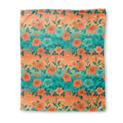 A vibrant, retro-style pattern of orange and teal hibiscus flowers with dark green leaves. The background is a stylized sunset gradient, shifting from warm orange to cool turquoise, with subtle clouds creating a serene, tropical atmosphere.