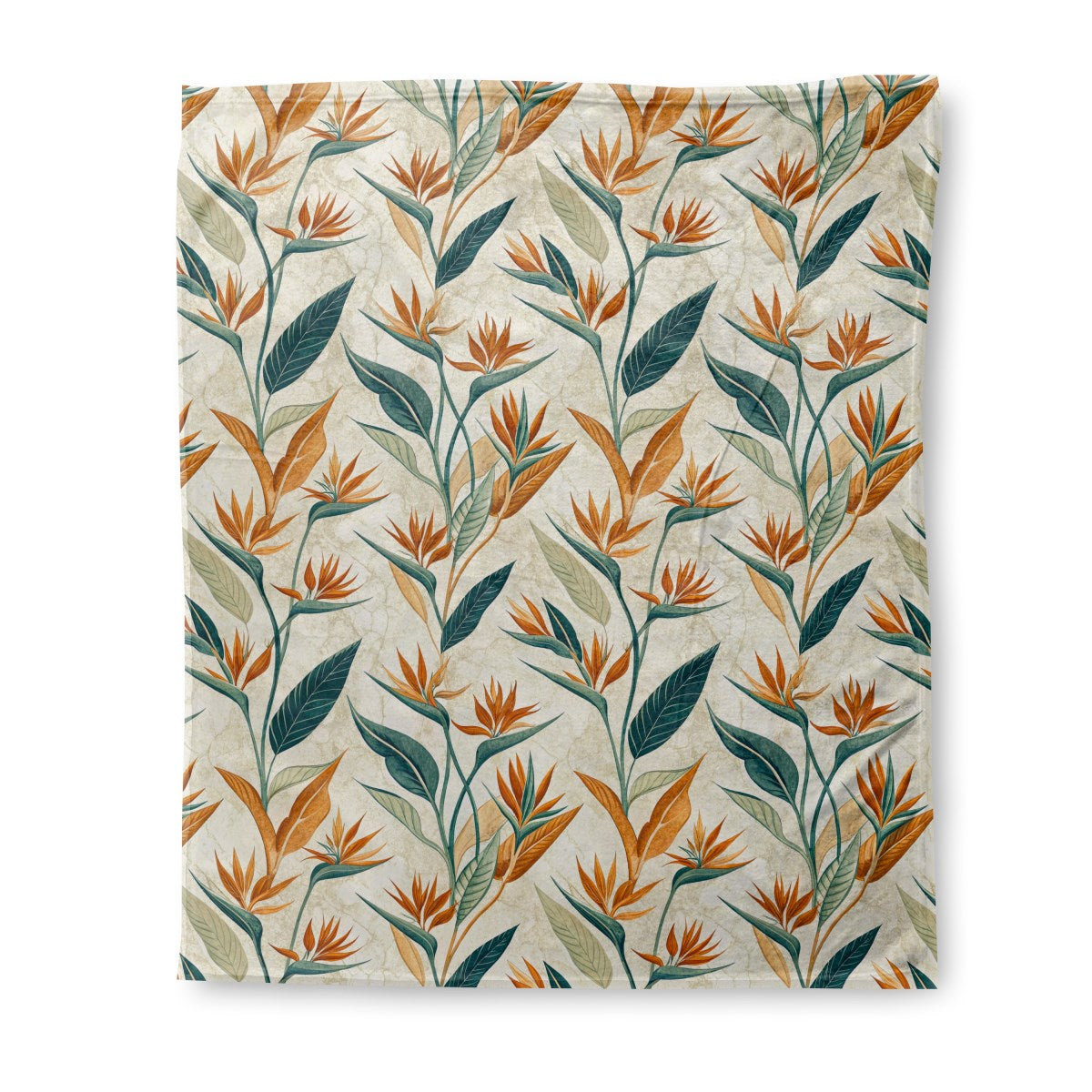 This is a stylized botanical pattern featuring Bird of Paradise flowers and tropical leaves. The design uses a warm, earthy color palette of burnt orange, terracotta, and deep greens, set against a textured, light-beige background with a subtle crackled effect for a vintage feel.