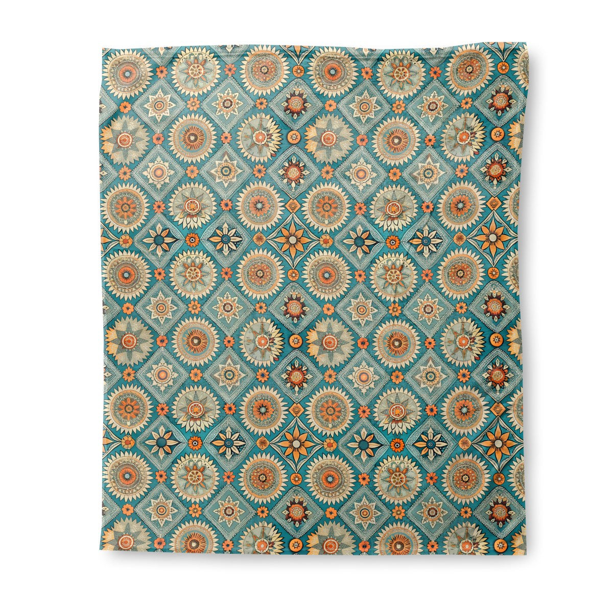A vibrant, bohemian tile pattern features intricate sun and floral mandalas. The detailed orange, cream, and beige motifs are set within ornate diamond shapes on a rich teal background, creating a decorative, folk-art feel.