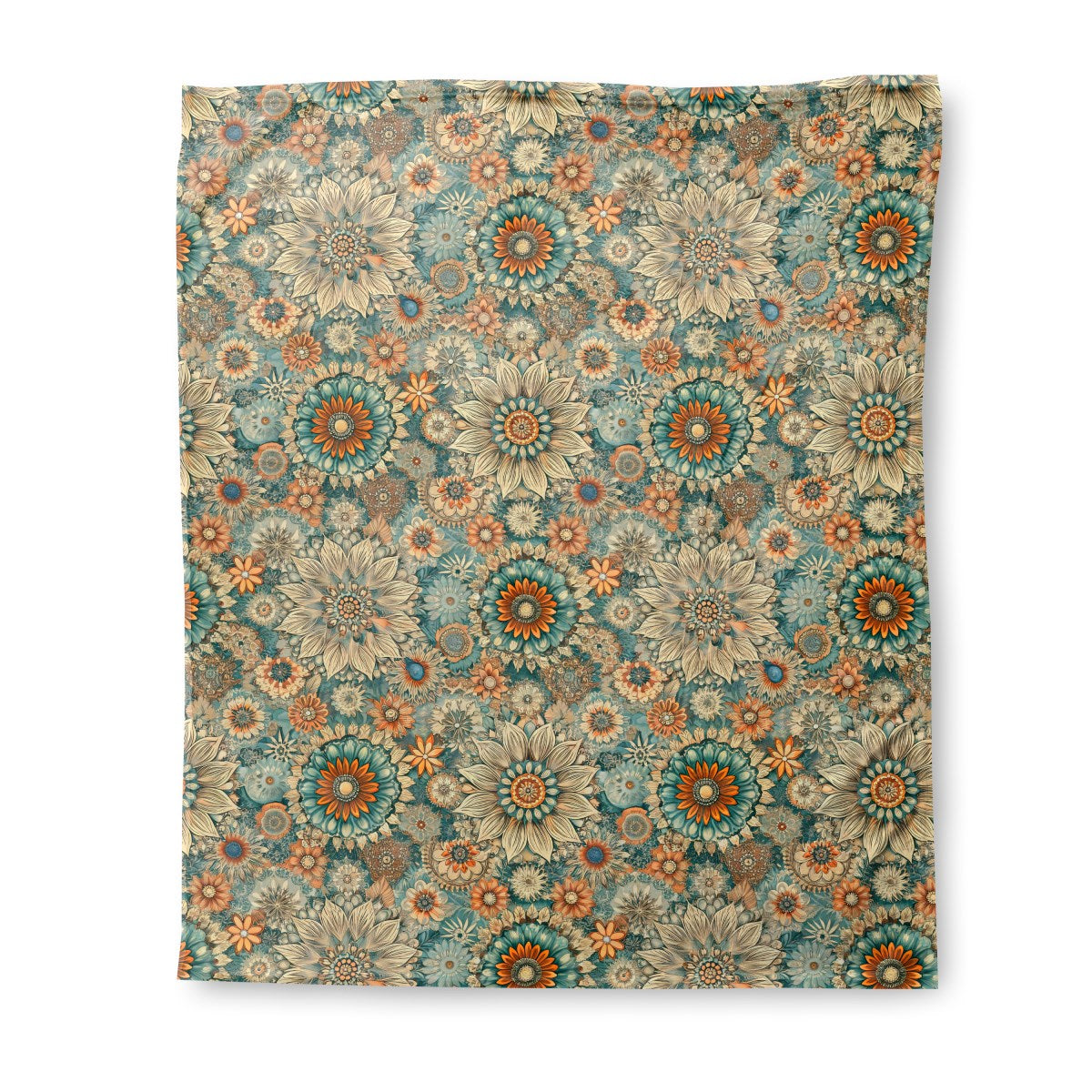 A dense, retro-style floral pattern features intricately detailed flowers. The busy, repeating design uses a striking color palette of teal, orange, and cream, creating a rich and decorative visual tapestry with a vintage, illustrative feel.