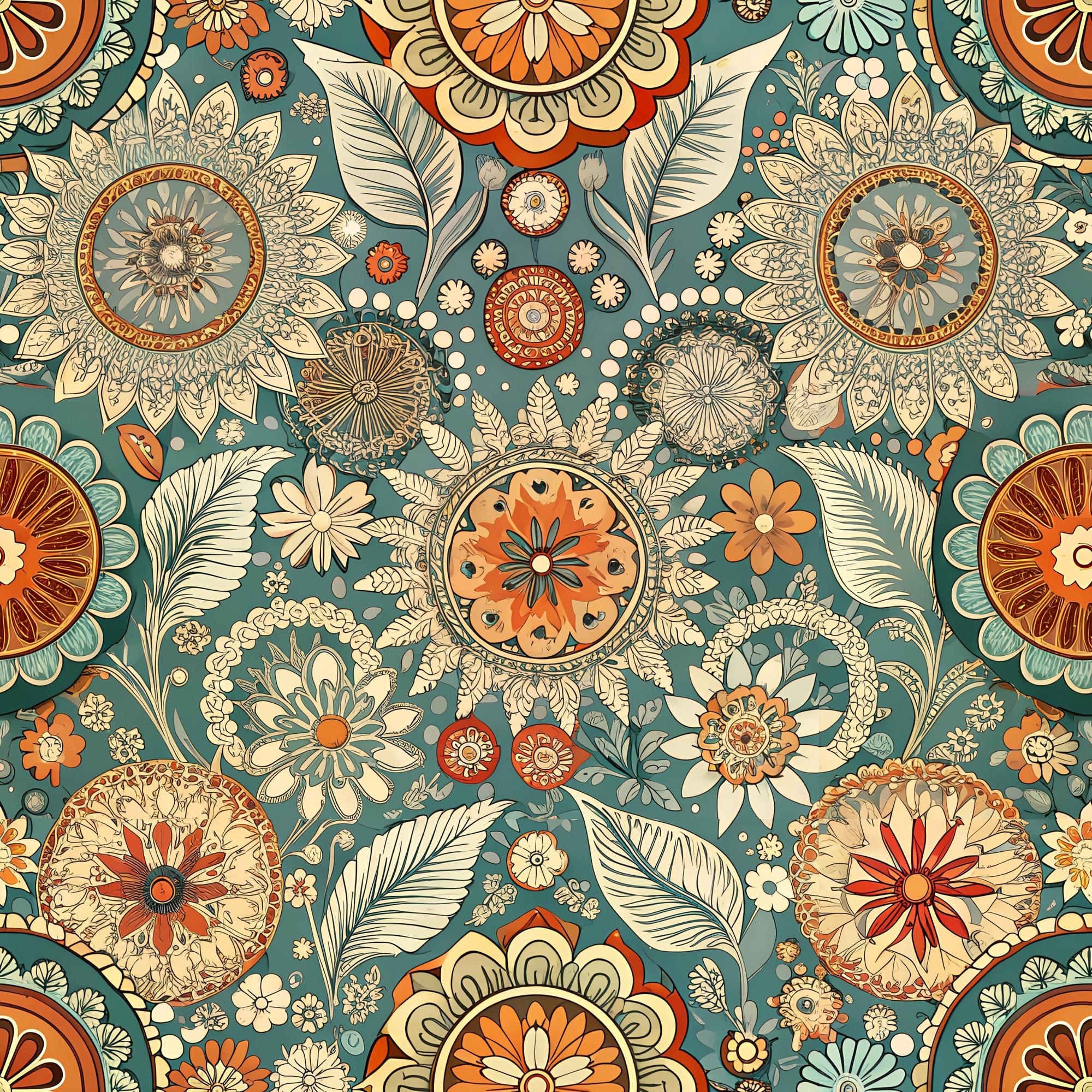 A vibrant, bohemian-style floral pattern featuring intricate, mandala-like flowers and stylized leaves. The rich color palette of teal, orange, and cream creates a warm, retro aesthetic on a dense, folk-art-inspired background.