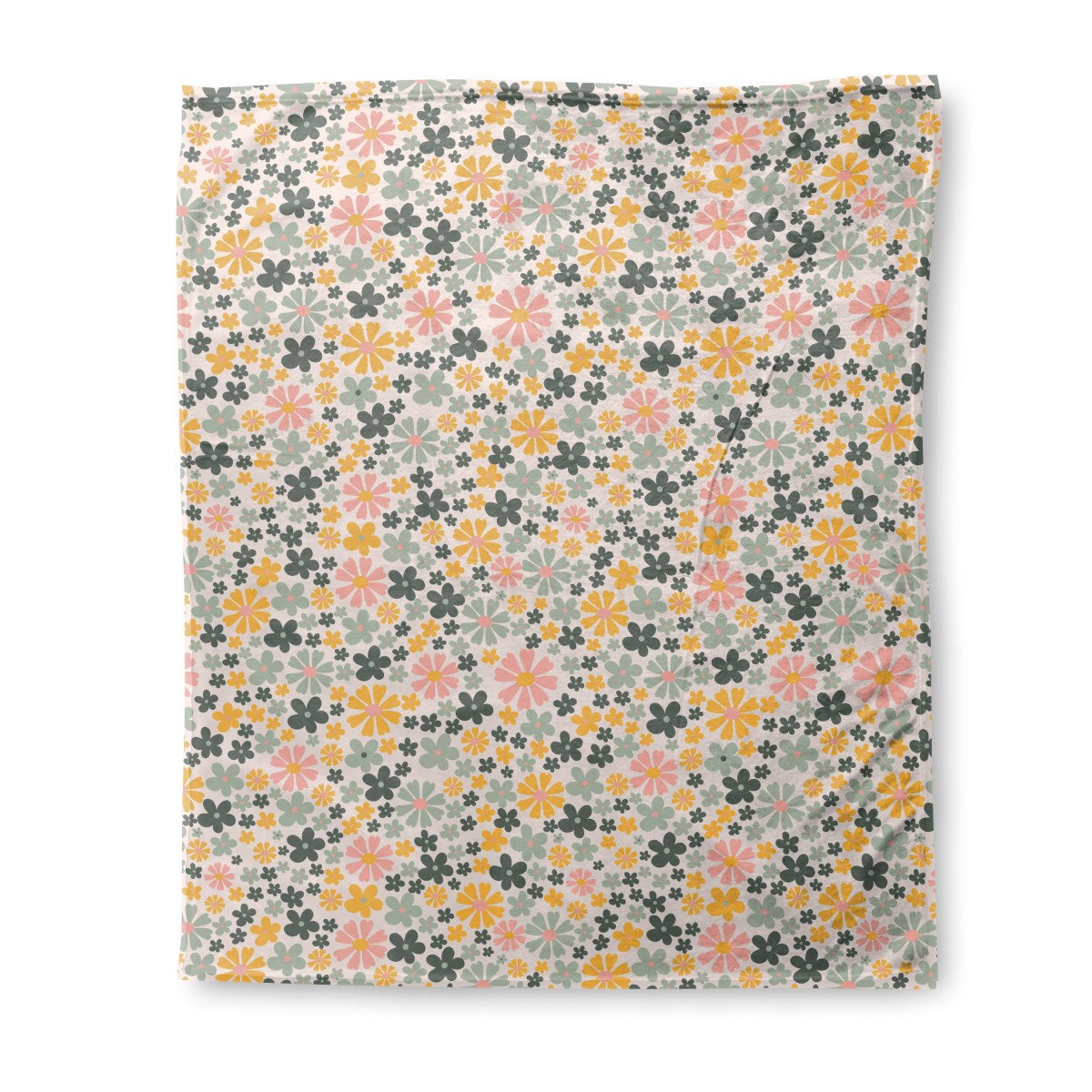 A retro-inspired, seamless pattern of stylized flowers. The ditsy floral print uses a muted color palette of pink, mustard yellow, sage, and dark green against a cream background, creating a groovy, 1970s aesthetic.