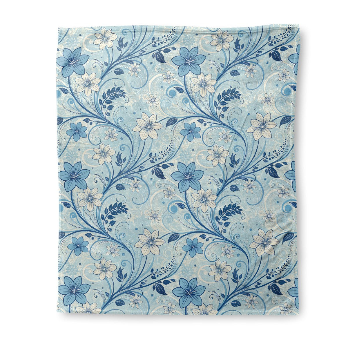An elegant, seamless pattern of stylized flowers and swirling vines. The intricate design features a classic color palette of blue, navy, and cream against a light blue background, creating a delicate and decorative composition.