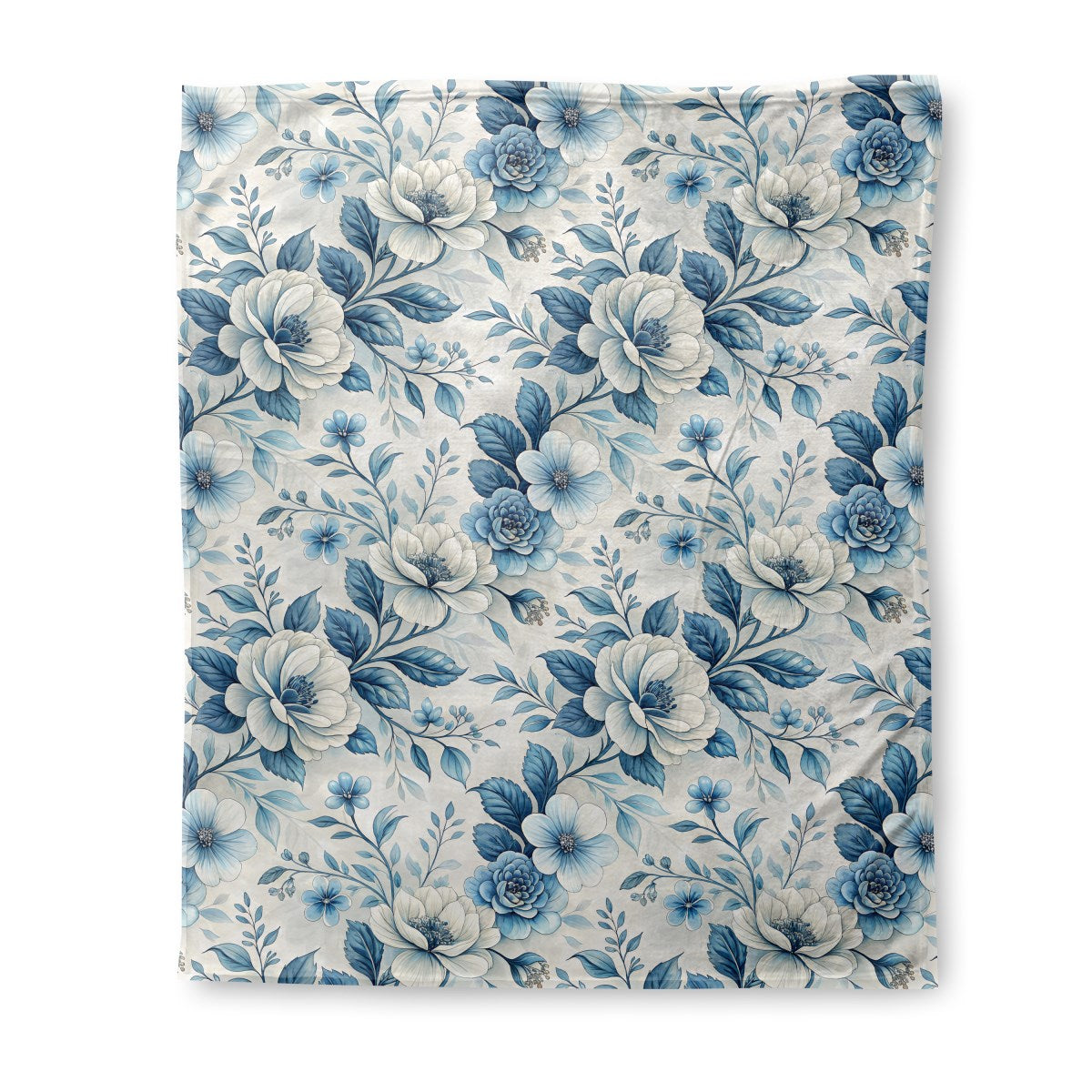 This is an elegant seamless pattern of blue and white flowers. Rendered in a delicate, watercolor-like style, the blossoms and dark blue leaves are set against a light, textured background, creating a classic and serene botanical design.
