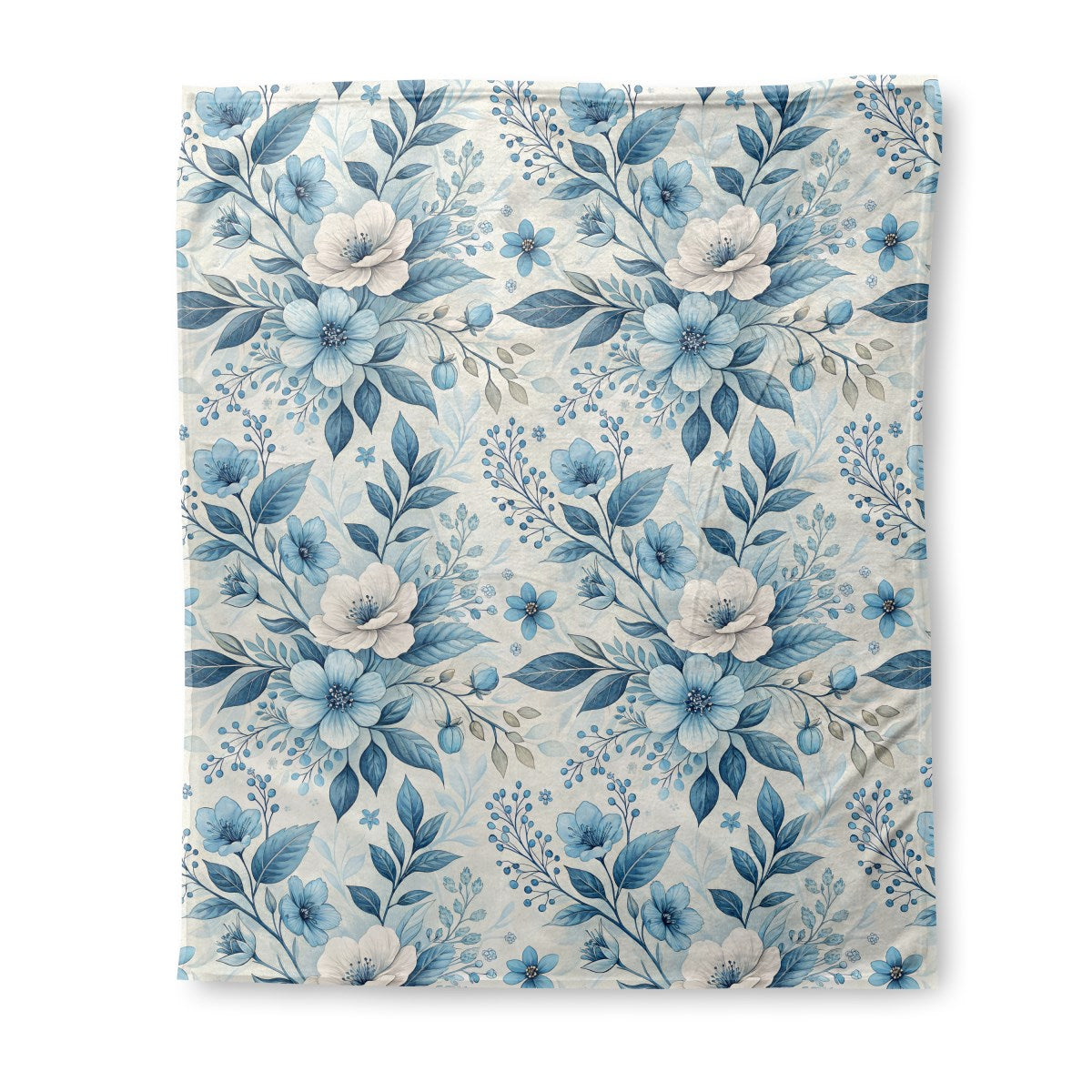 An elegant watercolor-style illustration of a floral pattern. The serene composition features delicate blue and white flowers, deep blue leaves, and small berries intertwined on a light, textured background, creating a classic and tranquil design.
