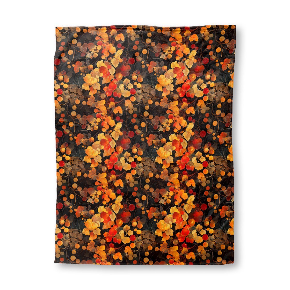 A vibrant, stylized botanical pattern features glowing leaves and berries in warm autumnal shades of orange, red, and yellow. The elegant, swirling elements are set against a dark background, creating a rich and dynamic composition with a painterly feel.