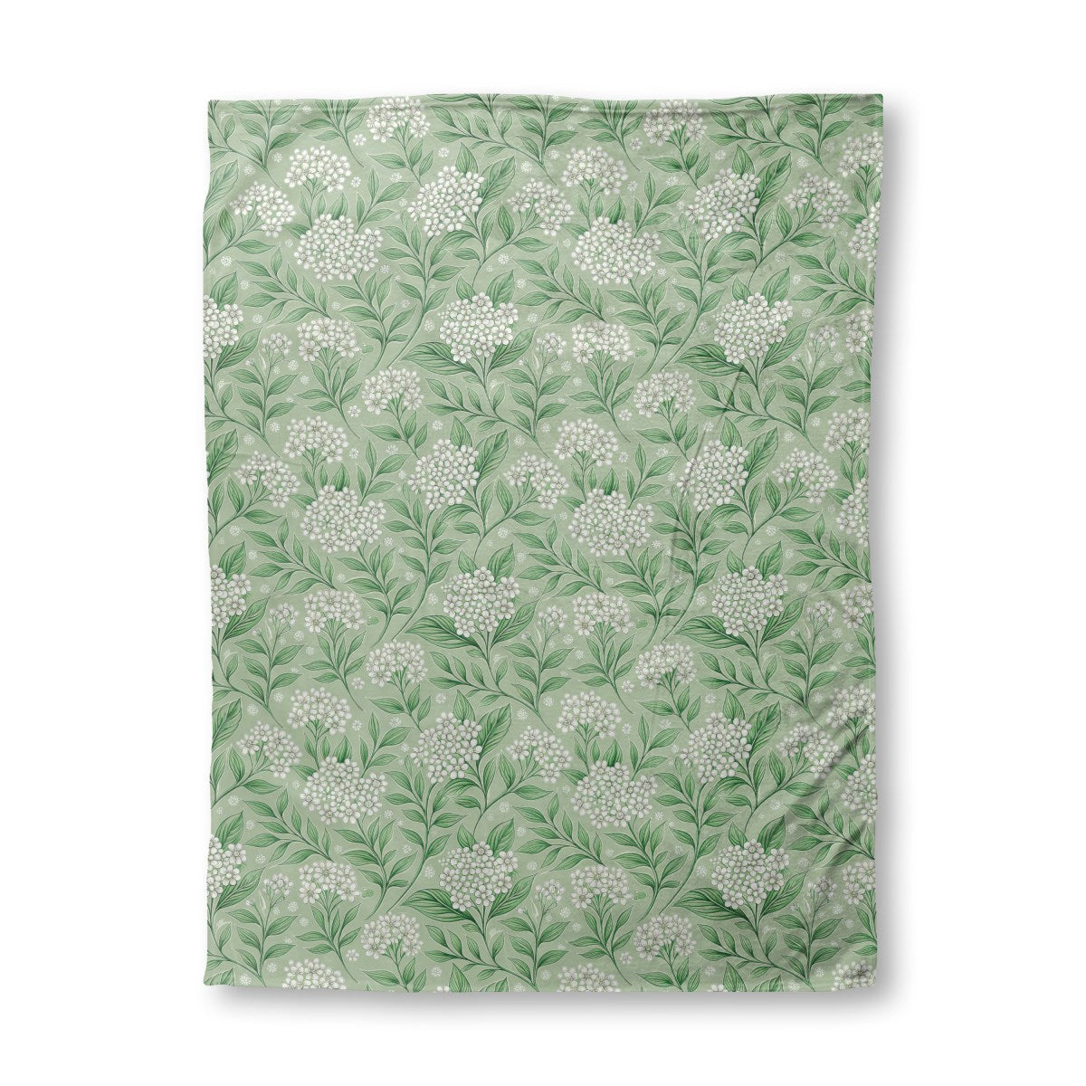 This is a seamless botanical pattern featuring elegant clusters of small white flowers and detailed green leaves. The graceful, curving stems are set against a soft sage green background, creating a classic, vintage-inspired design.