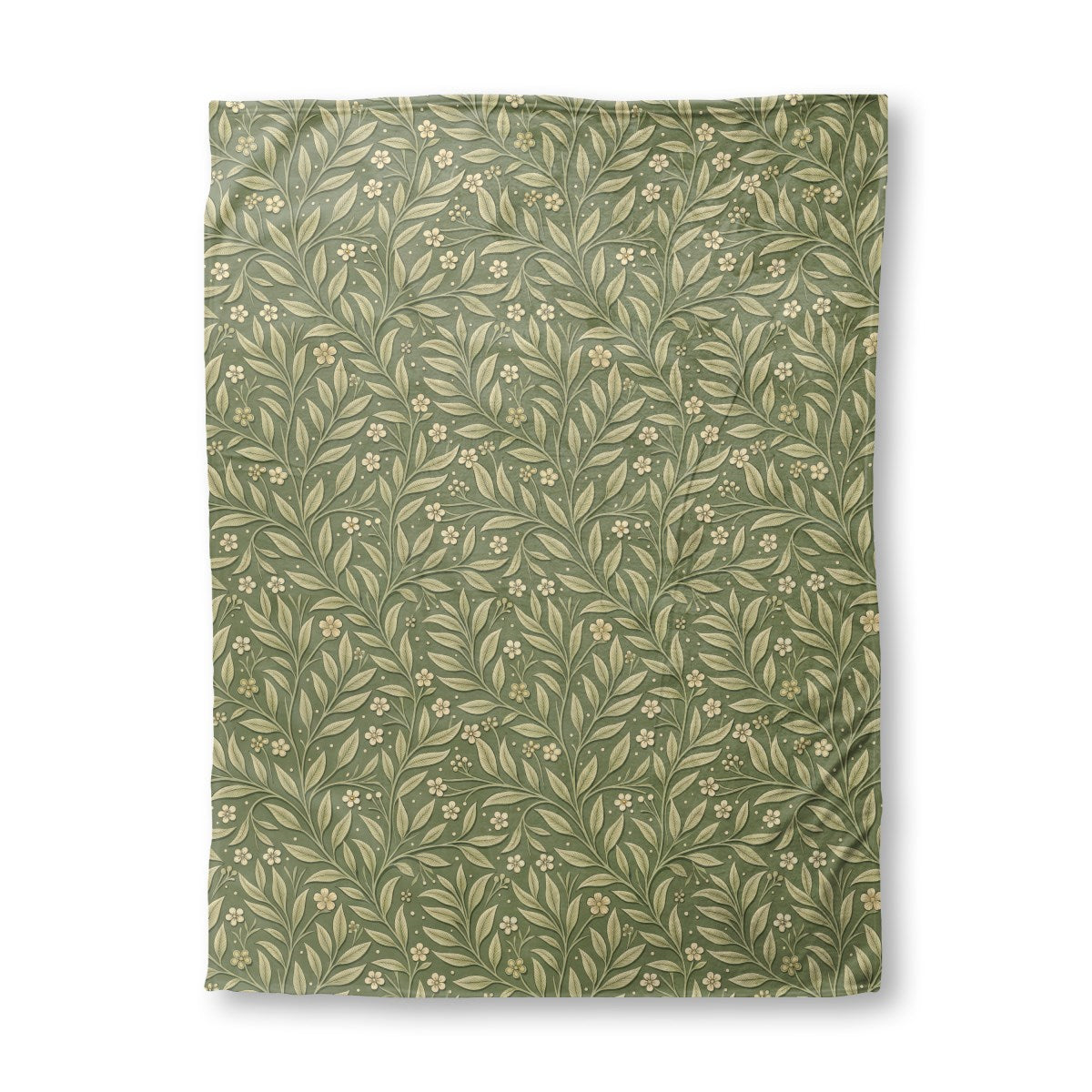 An elegant, Arts and Crafts-style botanical pattern featuring intertwining vines with veined leaves and small cream flowers. The seamless design is set against a dark sage green background, giving it a classic, embossed wallpaper appearance with a subtle three-dimensional quality.
