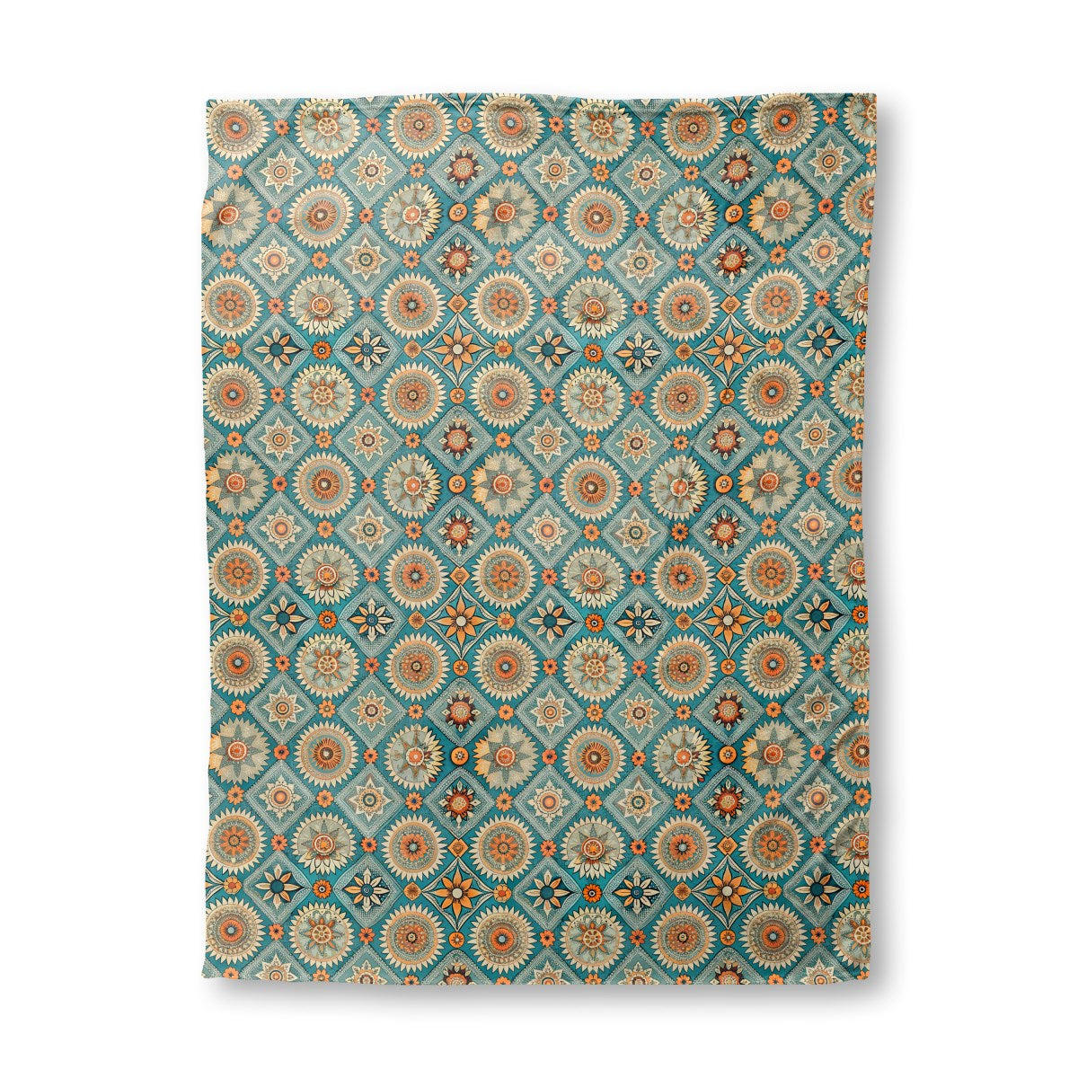A vibrant, bohemian tile pattern features intricate sun and floral mandalas. The detailed orange, cream, and beige motifs are set within ornate diamond shapes on a rich teal background, creating a decorative, folk-art feel.