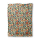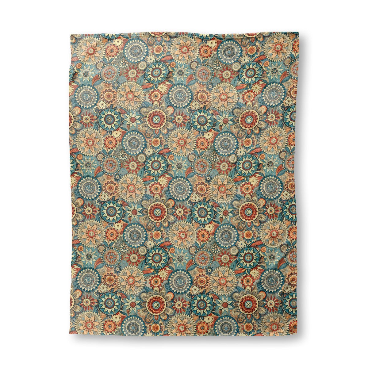 A dense, bohemian-style pattern of intricate, hand-drawn mandalas and stylized flowers. The collage-like design uses an earthy color palette of teal, orange, and cream, creating a vintage, folk-art feel.