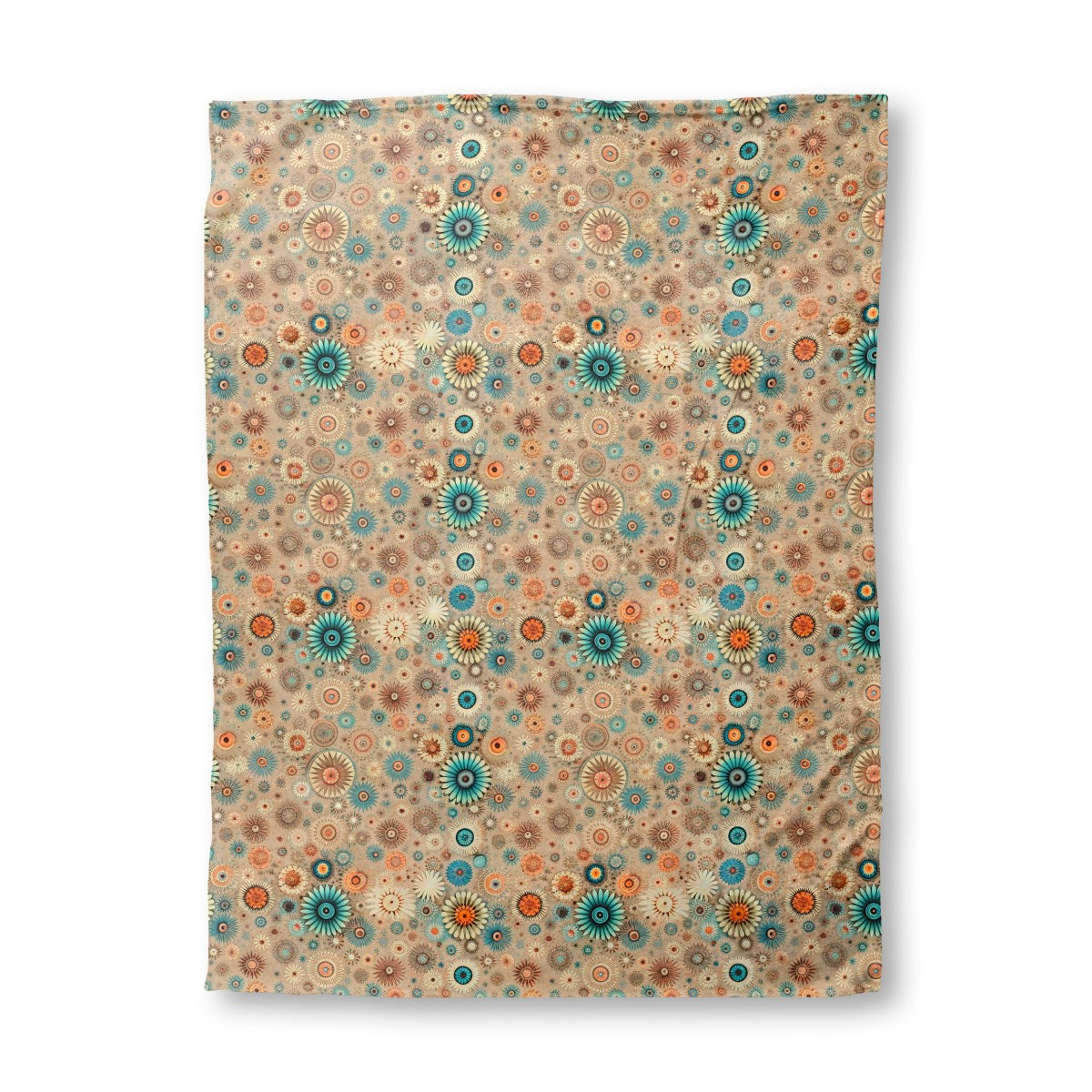 A dense, artistic collage of stylized flowers and circular motifs. The intricate designs feature a retro color palette of teal, orange, and earth tones against a textured background, creating a vibrant, bohemian-inspired pattern.