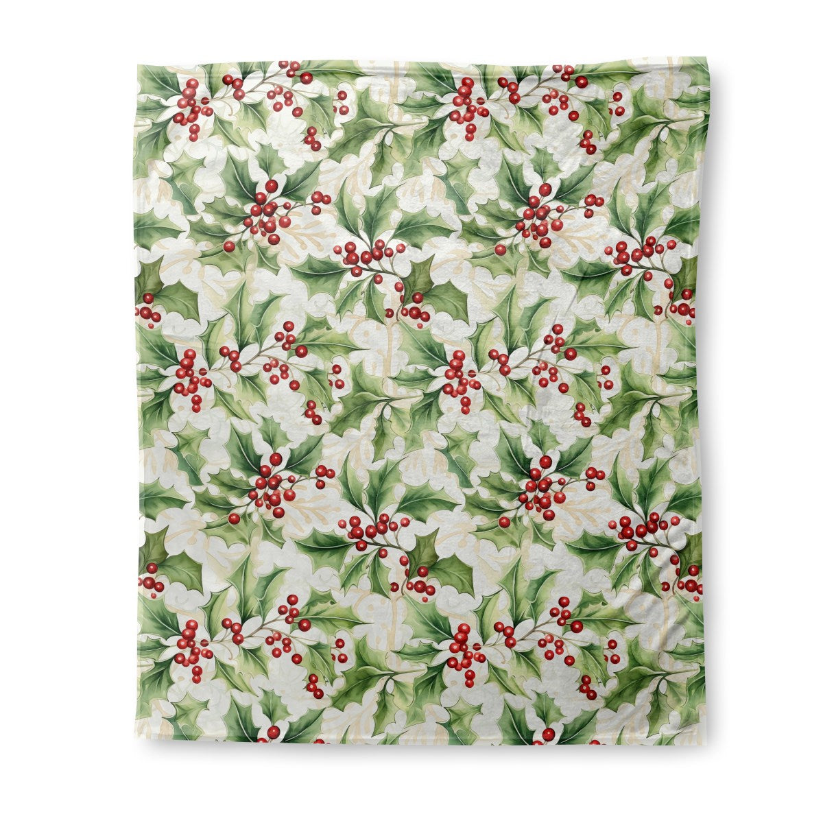 This is a seamless watercolor pattern of festive holly. The design features sprigs with spiky green leaves and clusters of bright red berries, layered over a light background with faint silhouettes of leaves, creating an elegant, classic holiday feel.