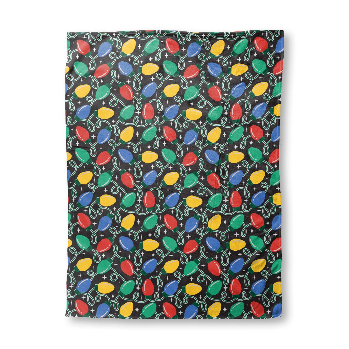 A festive, repeating pattern of colorful Christmas lights. The red, blue, green, and yellow bulbs are strung on looping white wires against a black background. White sparkles add a touch of magic to the cheerful, retro-style holiday design.