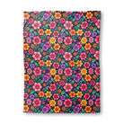 A vibrant, seamless pattern of stylized folk-art flowers. The bold, colorful blossoms in shades of pink, orange, and purple, along with green leaves, stand out against a dark navy background, creating a dense and cheerful composition.