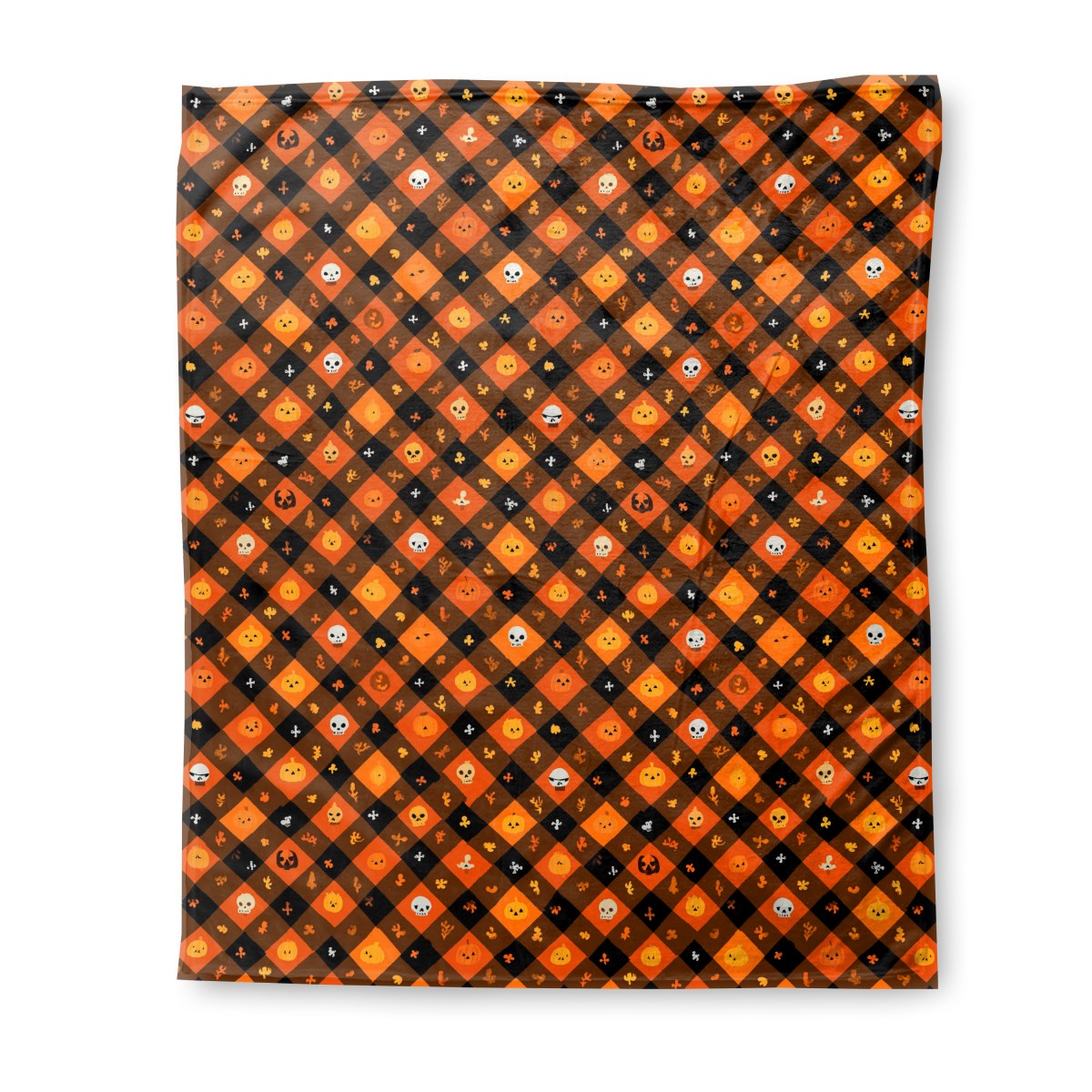 A whimsical, seamless Halloween pattern featuring a diagonal plaid in orange, black, and brown. The design is scattered with hand-drawn, cartoonish skulls, jack-o'-lanterns, and other small autumnal motifs, creating a festive and spooky-cute feel.