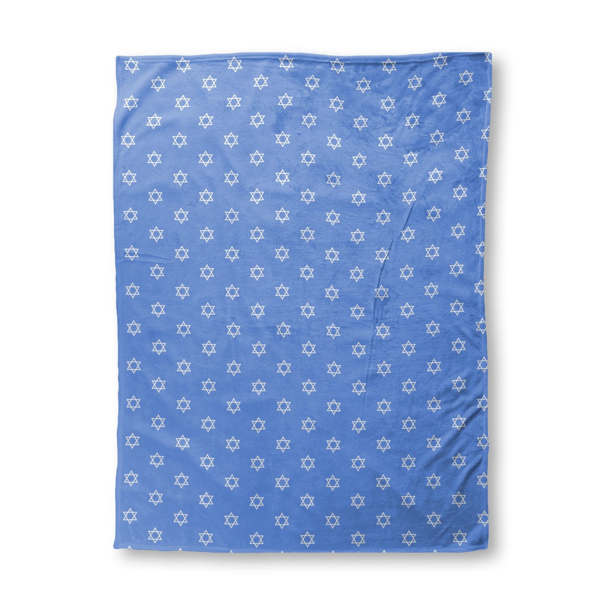 A seamless pattern features white Stars of David, a well-known symbol of Judaism, arranged in an orderly grid against a solid blue background.