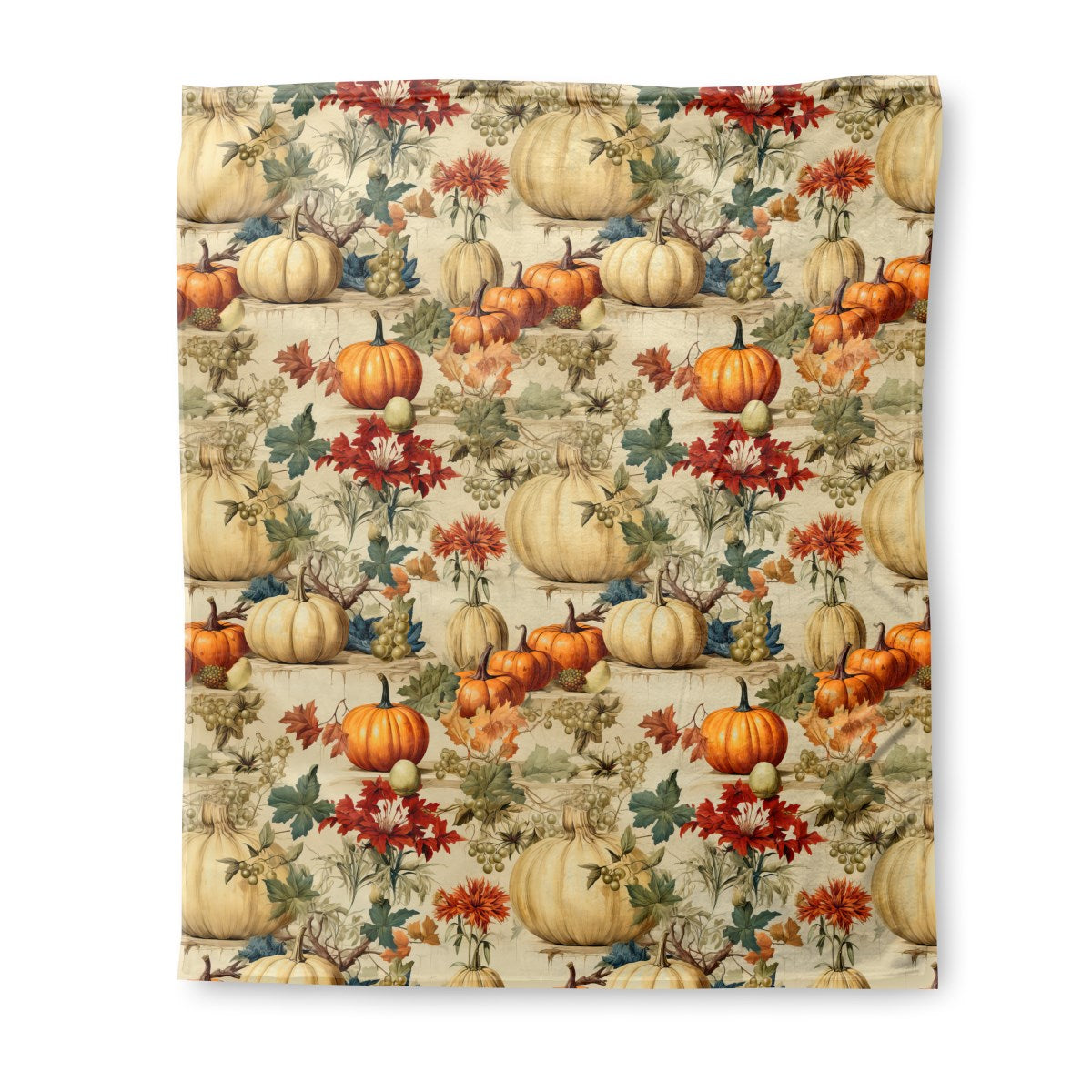 A vintage-style illustration of a bountiful autumn harvest. Orange and pale pumpkins, grapes, and colorful foliage are arranged on tiered stone ledges, creating a rich, decorative pattern with a classic, botanical feel.