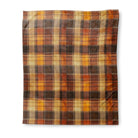A close-up of a textured plaid fabric in a warm, autumnal color palette. The classic tartan pattern features intersecting stripes of brown, orange, mustard yellow, and beige, creating a cozy and rustic look.