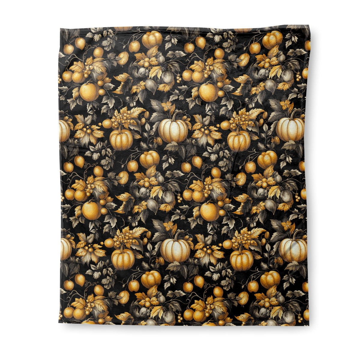 A luxurious, vintage-style pattern of autumnal fruits and foliage. Rendered in a detailed engraving style, golden pumpkins, apples, and grapes contrast richly with silver-toned leaves against a dramatic black background, creating an opulent and seamless design.